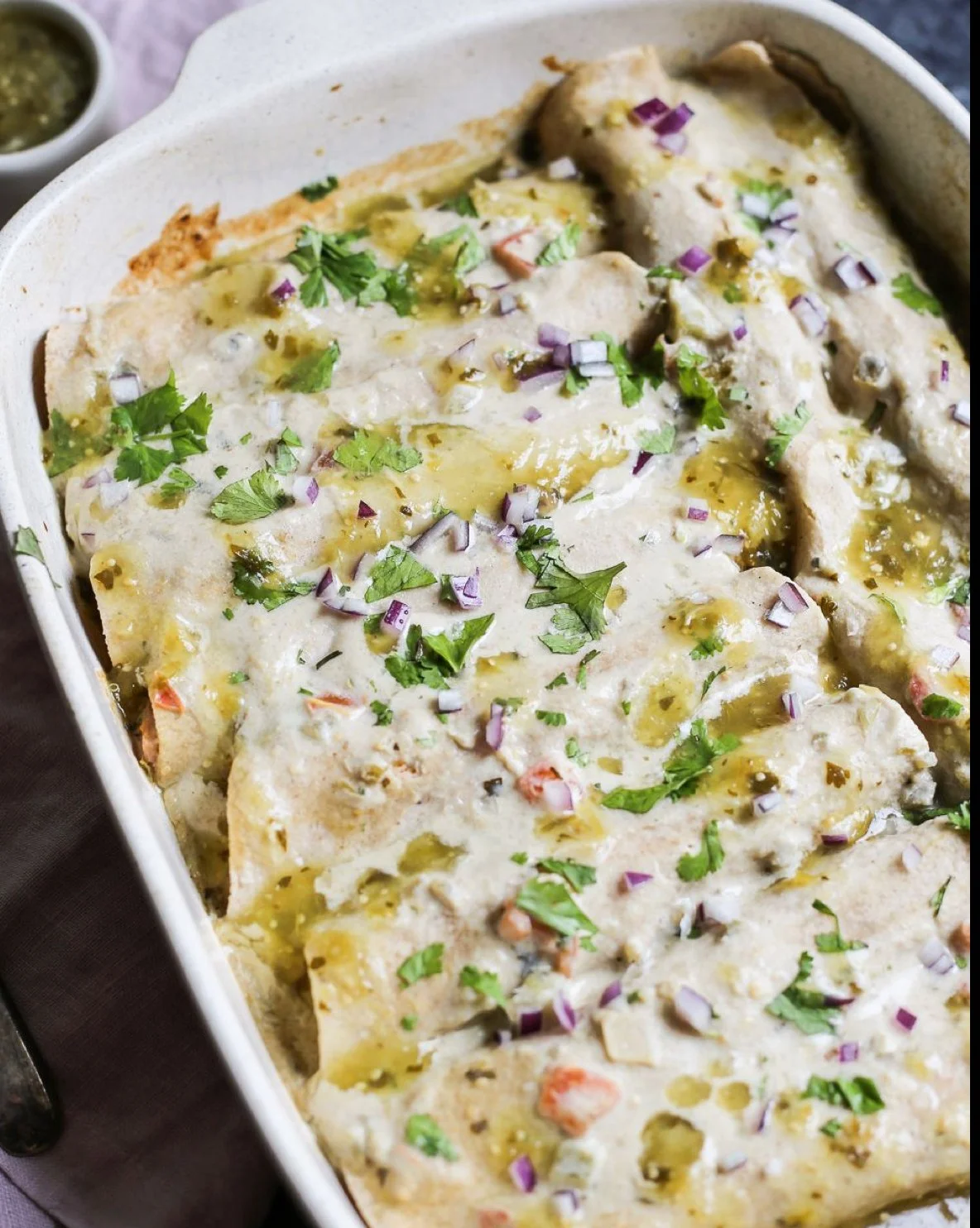 A street corn and chilies chicken rolled in tortillas and baked with a fresh enchilada sauce and mixed cheeses