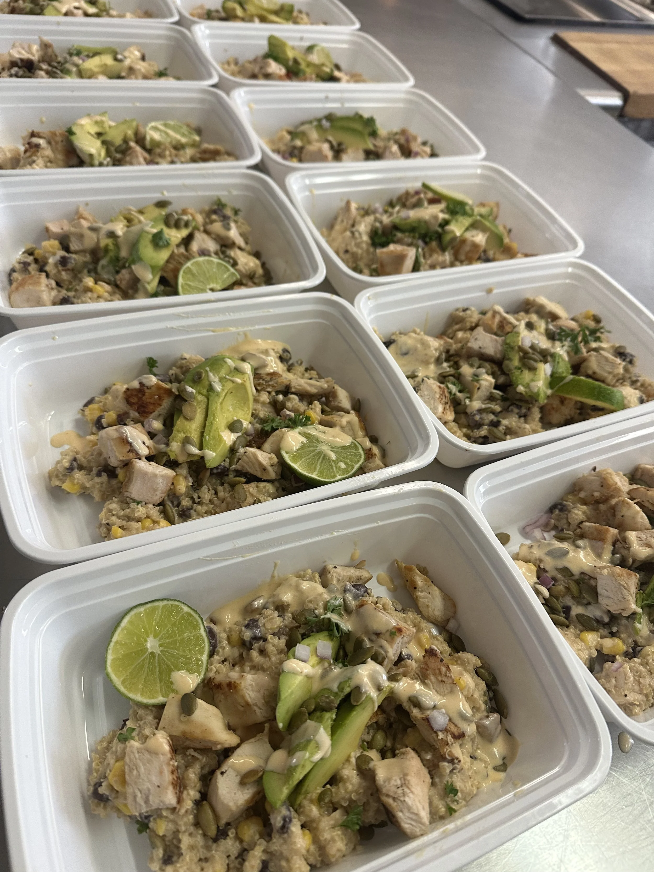 Chicken quinoa with a creamy chipotle sauce, avocado, pumpkin seeds, corn, and cilantro
