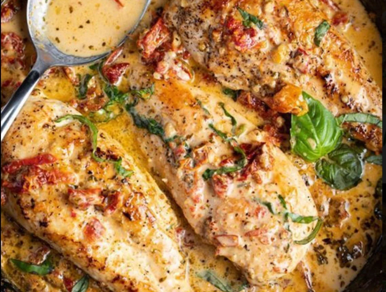 Flavorful chicken breast cooked in a creamy, sun dried tomato and Parmesan sauce with a side of fresh green beans