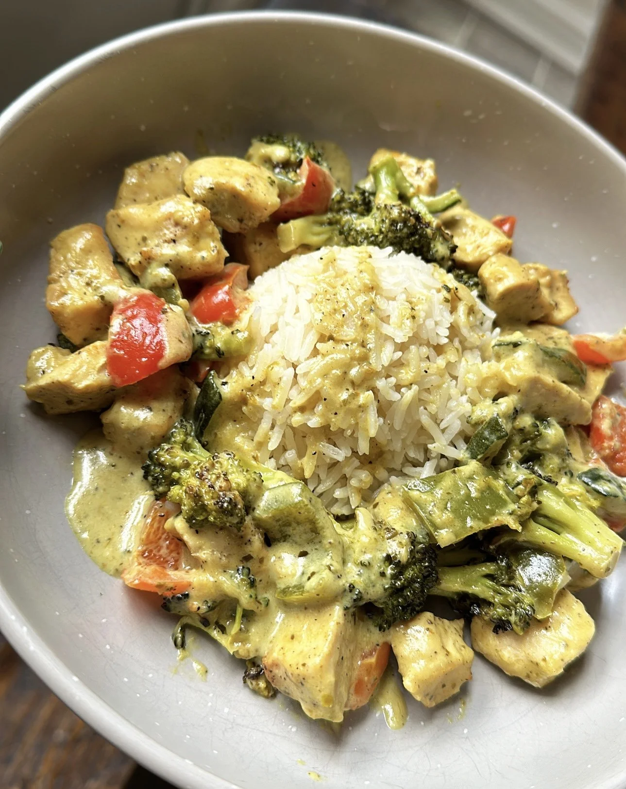Grilled chicken in a creamy green curry sauce with fresh vegetables and rice.